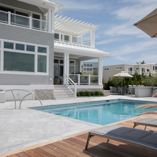 Nevertheless, through a judicious, yet well-placed use of various hardscaping materials--including ipe hardwood decking, marble tiles, standard paver stone and washed pebbles—along with stately privacy and summer-flowering plants and a classic, Reynolds-designed rectangular-shaped swimming pool overlooking the large expanse of Barnegat Bay, a refined and elegant outdoor living area, befitting the dwelling it supported, was created.